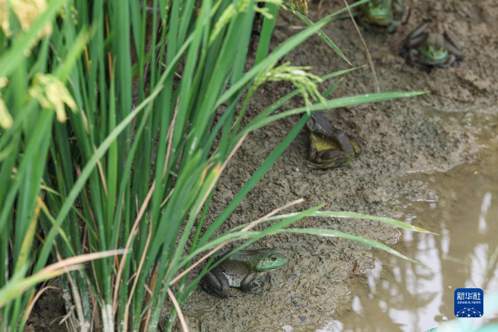 這是10月13日在杭州臨安太陽鎮的杭州佳稷農業生態稻米種植基地拍攝的稻田里套養的牛蛙,套養能讓每畝增收2000至3000元。