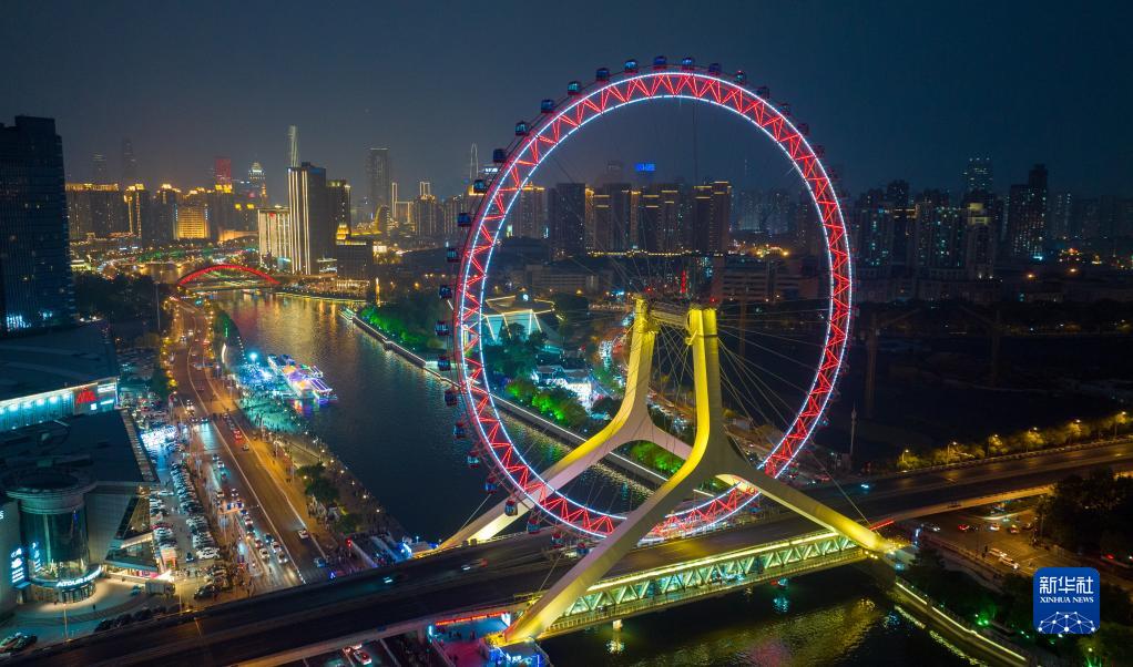 這是4月27日晚拍攝的“天津之眼”摩天輪夜景(無人機照片)。