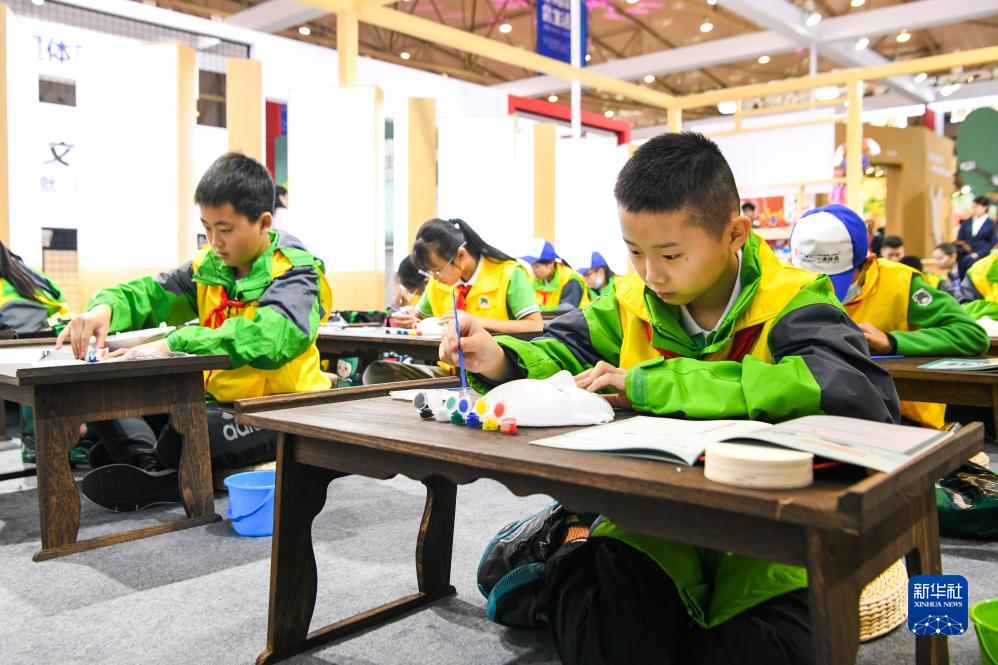 10月13日,在位于成都市世紀城新國際會展中心的2023天府書展主展場,參加研學活動的學生在體驗臉譜繪制。