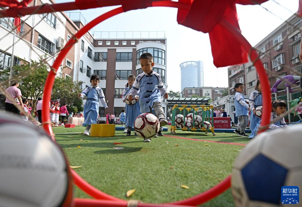 10月13日,天津市和平區第五幼兒園的孩子們參加趣味足球比賽。