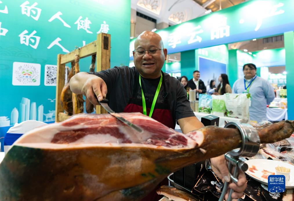 10月13日,一名參展商在云南國際餐飲美食暨預制菜產業博覽會上切諾鄧火腿。