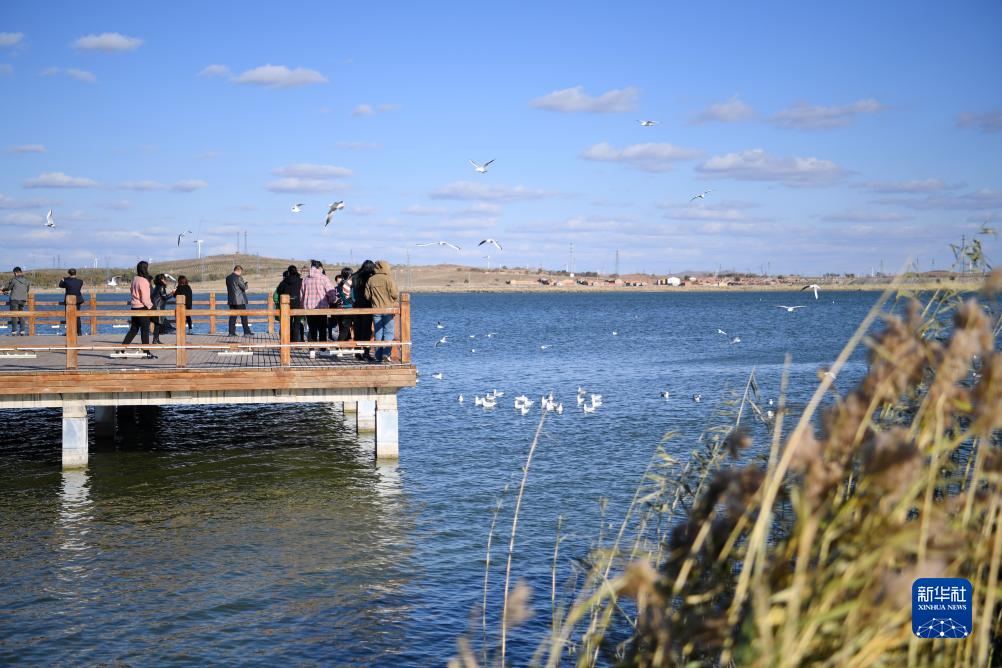 10月13日,游客在康巴諾爾國家濕地公園內觀賞紅嘴鷗。