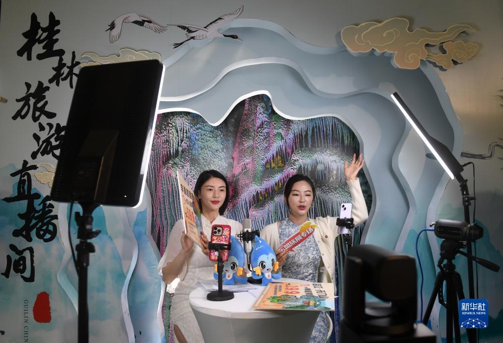10月13日,在廣西桂林新國際會展中心,兩名女子在旅游展上通過網絡直播推介旅游產品。