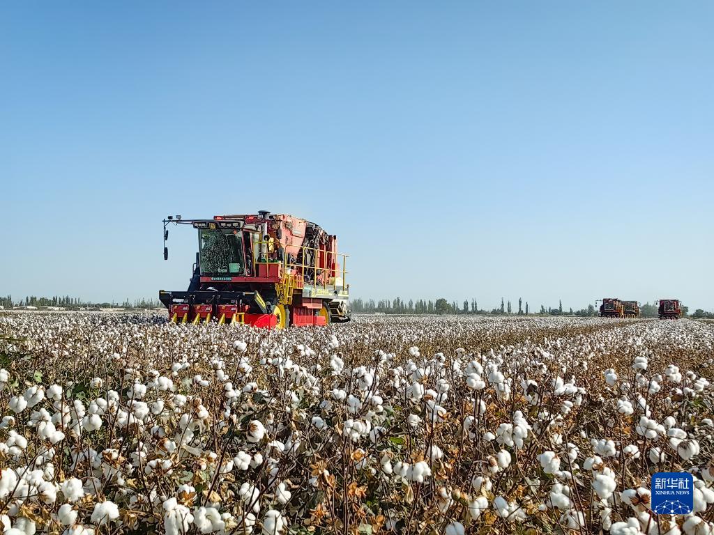 10月12日,在庫爾勒市普惠農場一處棉田,農民駕駛大型采棉機采摘棉花。