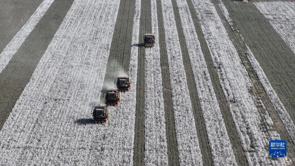 10月12日,在庫爾勒市普惠農場一處棉田,農民駕駛大型采棉機采摘棉花(無人機照片)。