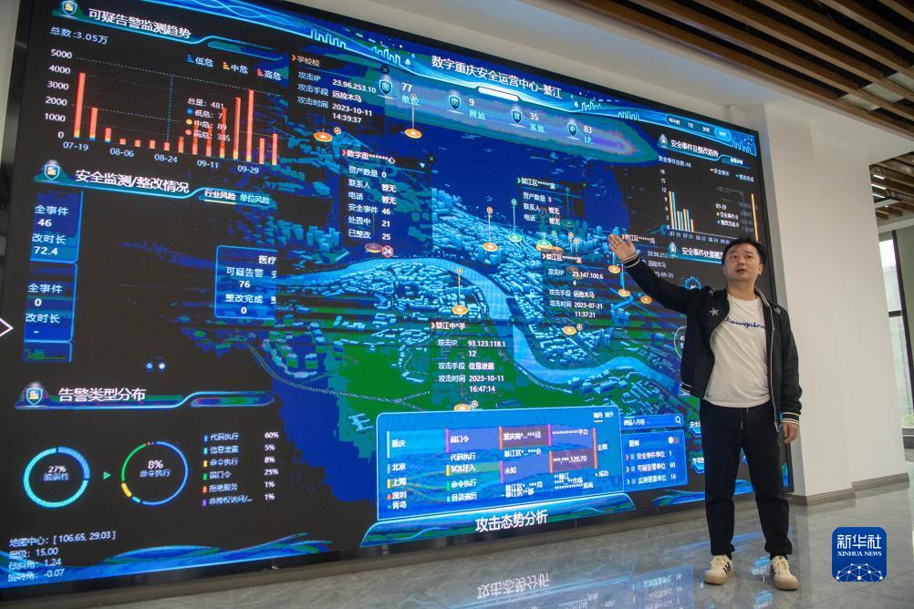 10月12日,在位于重慶市綦江區的奇安信數字重慶安全運營中心內,工作人員在介紹安全運營平臺的功能。重慶綦江區在推進傳統產業數字化改造的同時,大力培育戰略性新興產業,以衛星制造和大數據應用為核心的新一代信息技術、新材料、裝備制造、節能環保、消費品工業五個新產業呈現集群化發展的良好態勢。