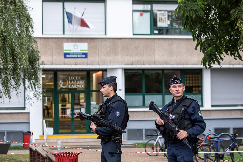 10月13日,在法國北部城市阿拉斯,警察在發生襲擊事件的甘貝塔高中外警戒。