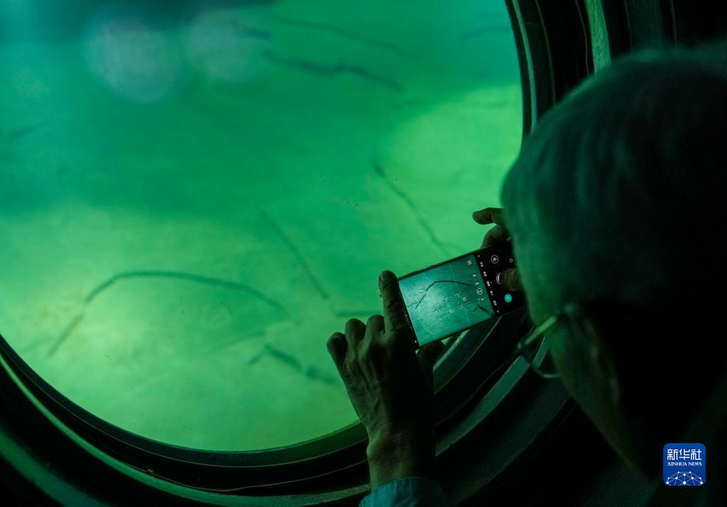 10月13日,游客在重慶涪陵白鶴梁水下博物館的水下參觀廊道內通過觀景窗拍攝保護罩內的白鶴梁題刻。