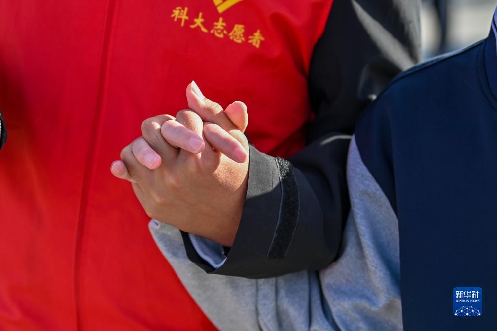10月13日,志愿者協助盲校學生在太原汾河公園參觀。