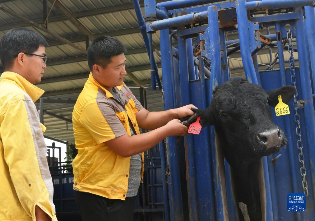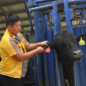 10月13日,河南省柘城縣一家肉牛養殖企業的技術人員給牛打上管理耳標。