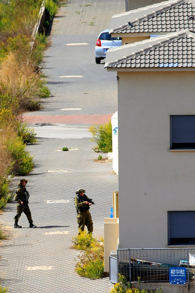 這張10月13日從黎巴嫩南部邊境城鎮希亞姆拍攝的照片顯示,以色列士兵在以色列北部梅圖拉搜查一處居民住宅。