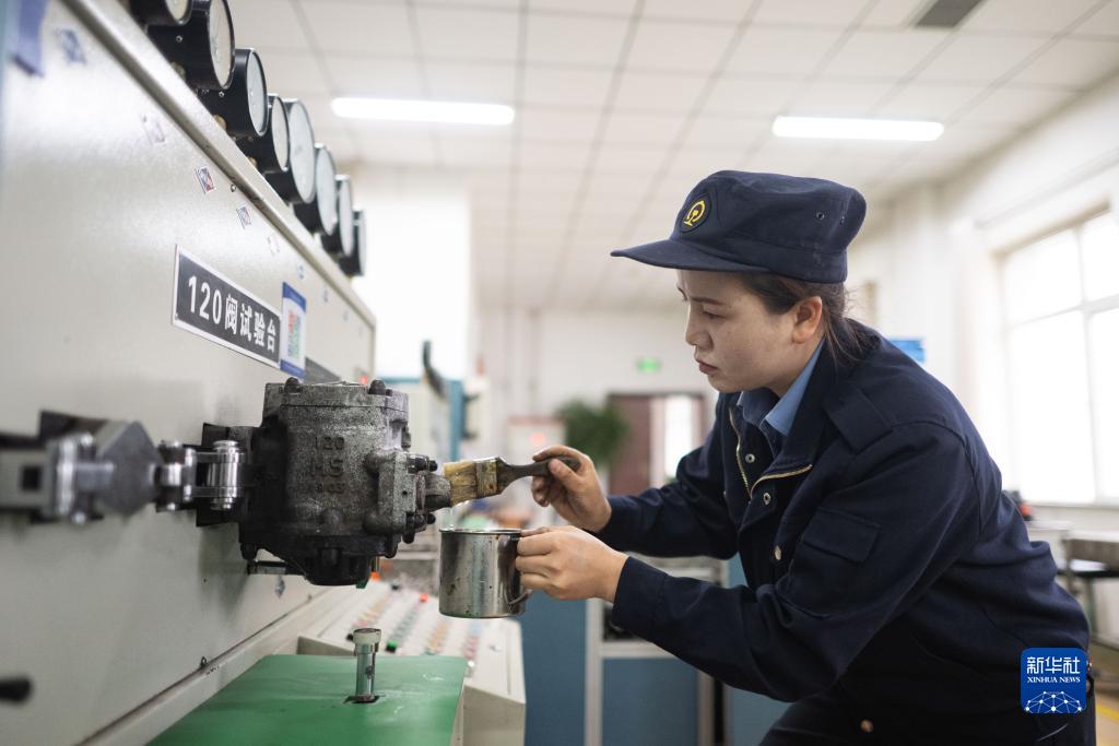 10月12日,在中國鐵路青藏集團有限公司西寧東車輛段制動班組,馬婷在120閥試驗時涂抹檢漏劑。