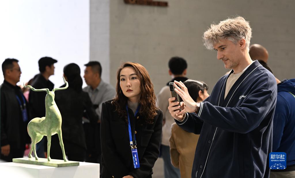 10月14日,觀眾在首屆呼和浩特國際雕塑藝術展上拍攝雕塑作品。