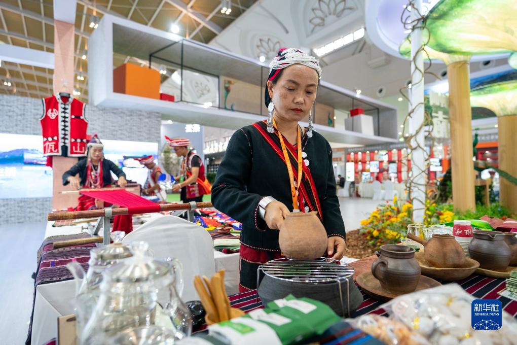10月14日,參展商在第十五屆中國云南普洱茶國際博覽交易會上制作烤茶。