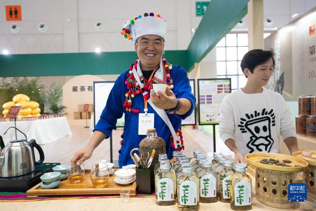 10月14日,參展商在第十五屆中國云南普洱茶國際博覽交易會上邀請參觀者品茶。
