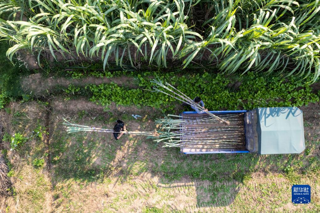 10月14日,在南縣烏嘴鄉港口村,村民把采收的甘蔗搬運上車(無人機照片)。