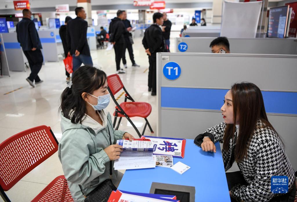 10月14日,求職者(左)在招聘會現場與用人單位工作人員交流。
