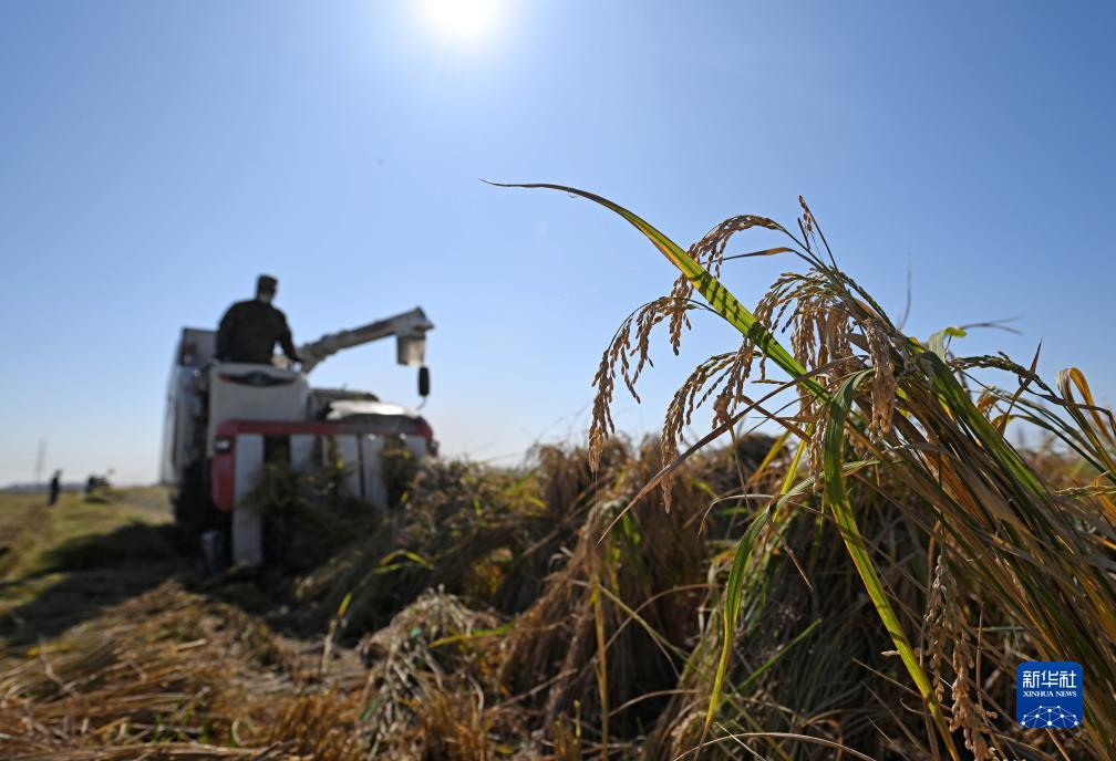 10月14日,收割機在天津市津南區小站鎮會館村小站稻核心種植區作業。