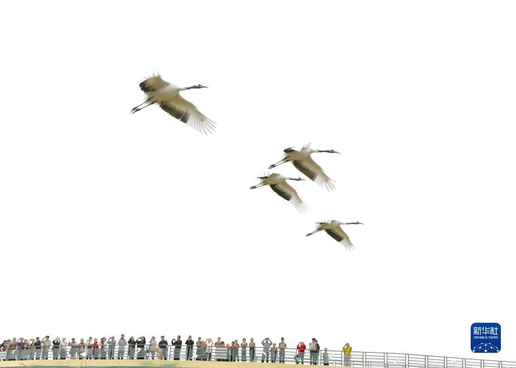 10月12日,一群丹頂鶴在山東東營黃河三角洲濕地飛翔。