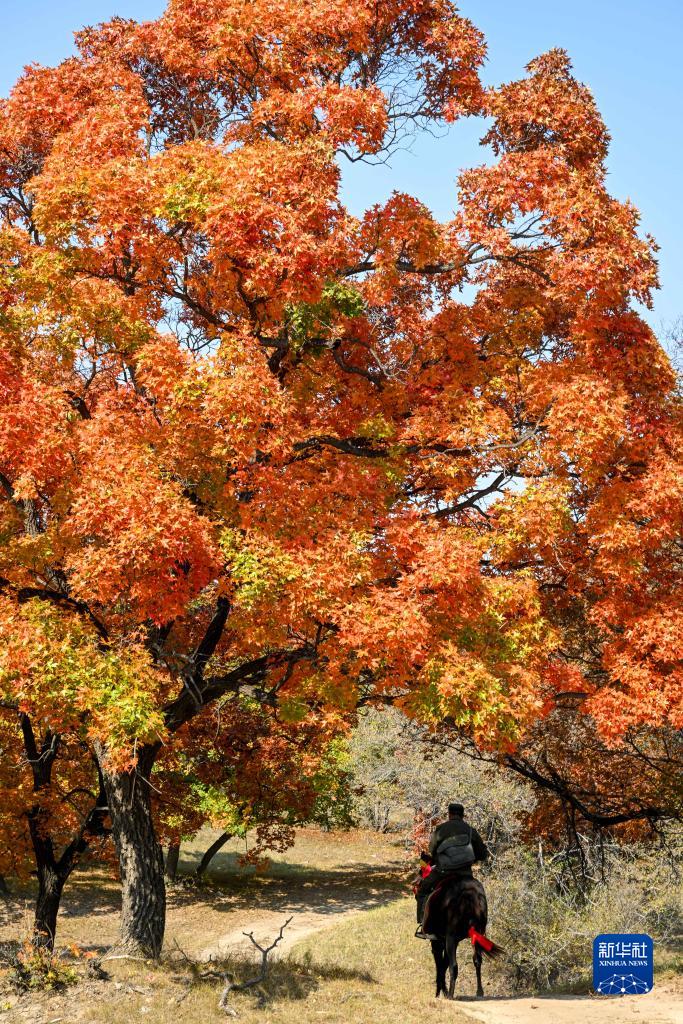 時值深秋,位于內蒙古自治區通遼市科爾沁左翼后旗的烏旦塔拉五角楓森林公園迎來一年中最美的時節,棵棵楓樹點綴秋日草原,美景如畫。
