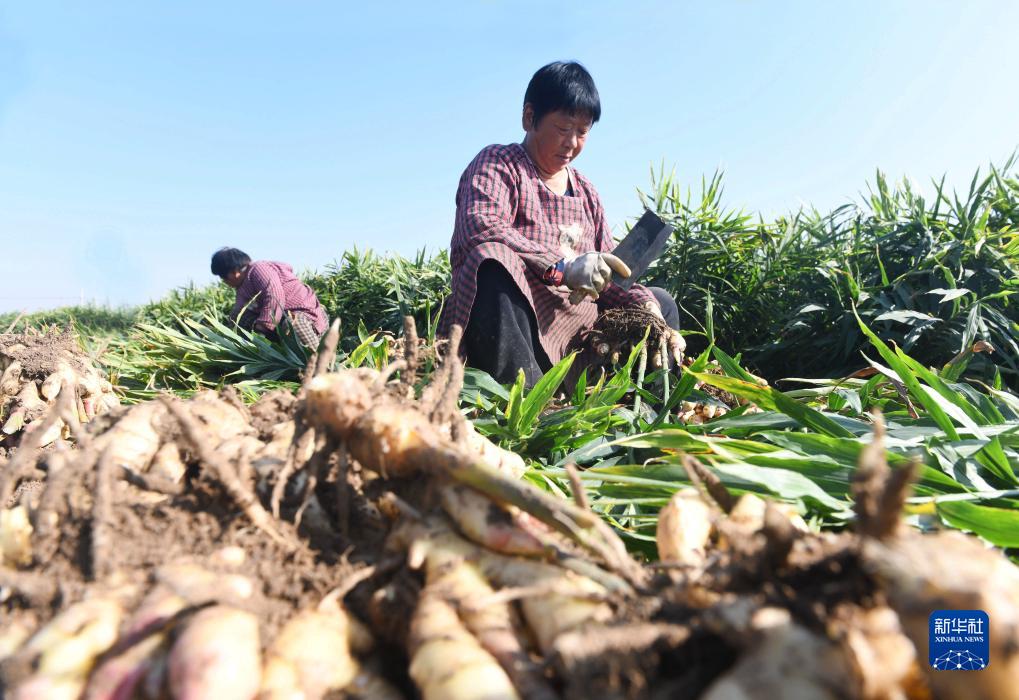 10月14日,河北省石家莊新樂市協神鄉北青同村農民在收獲生姜。
