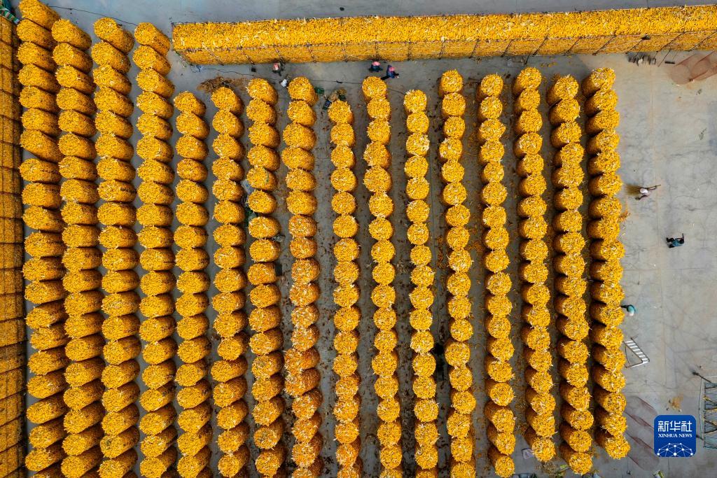 10月13日,在山東省東營市廣饒縣李鵲鎮雅文農民種植專業合作社,農民將收獲的玉米裝網晾曬(無人機照片)。