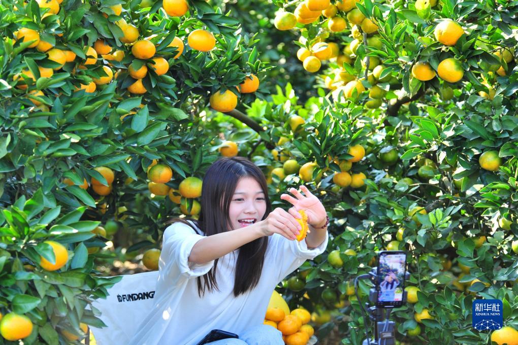 10月14日,農產品帶貨網絡主播在湖北省宜昌市夷陵區一家生態橘園向網友推介“夷陵紅”蜜橘。