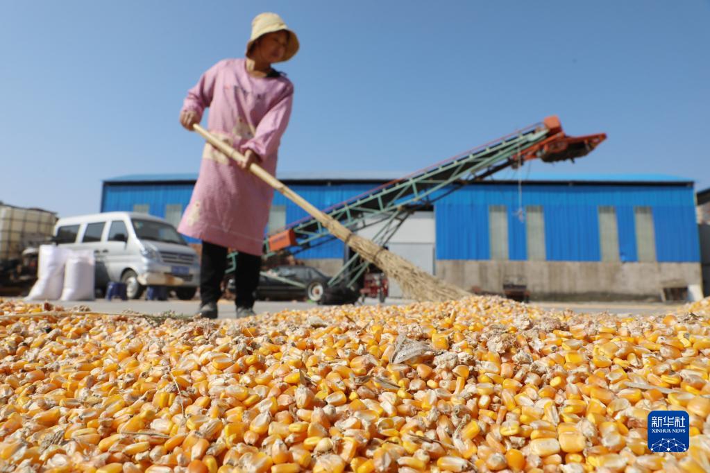 10月14日,河南省焦作市溫縣岳村街道西坡村農民在場院收晾曬干的玉米。