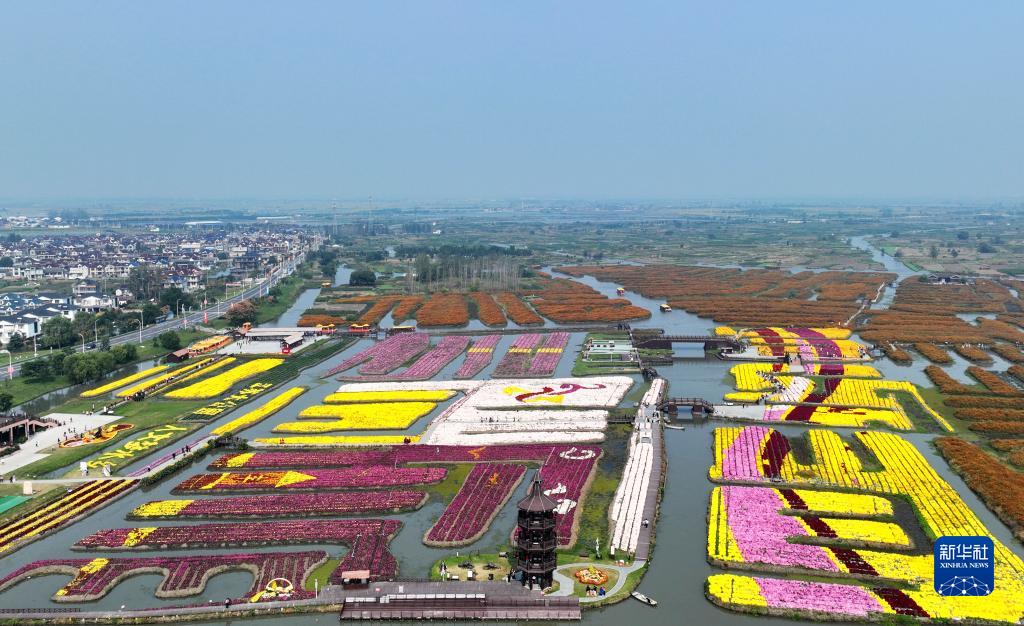 10月14日,游客在江蘇省興化市千垛景區賞菊游玩(無人機照片)。