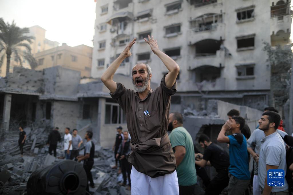 10月14日,在加沙地帶南部城市汗尤尼斯,人們在遭以色列空襲炸毀的建筑中救援。
