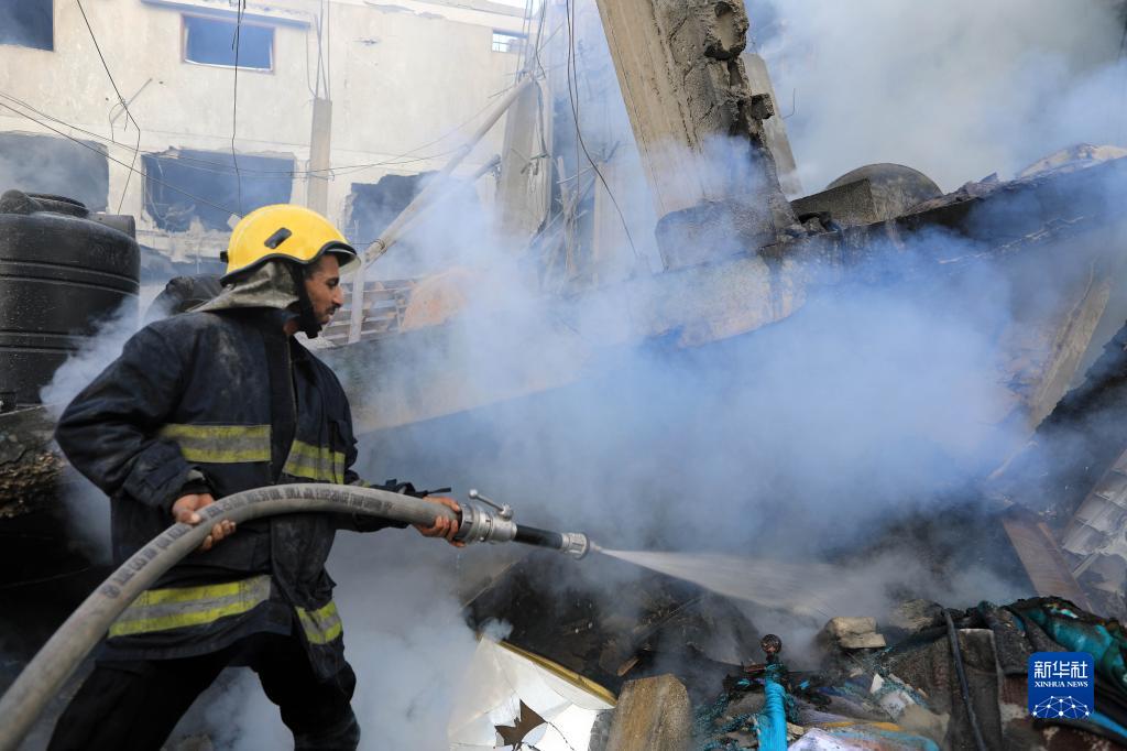 10月14日,在加沙地帶南部城市汗尤尼斯,一名消防員在撲滅以色列空襲造成的火災。