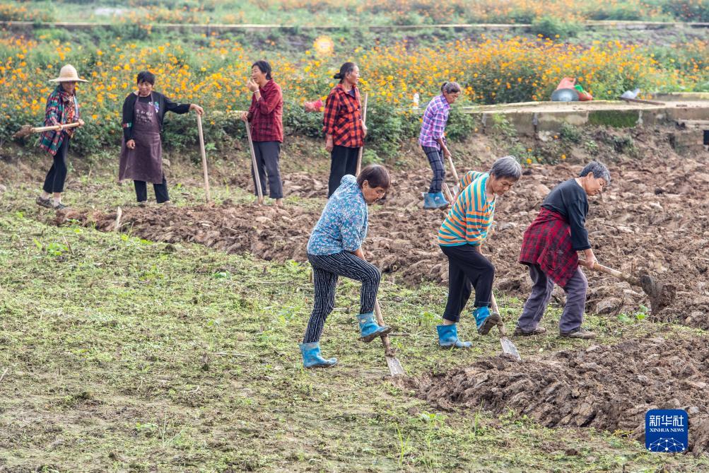 10月14日,重慶市將軍村的村民在田里翻土,為輪種油菜做準備。
