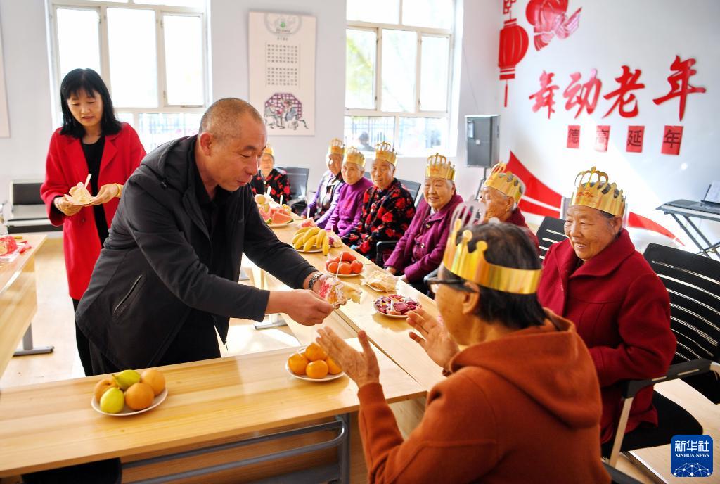 10月14日,河北省康??h土城子鎮互助幸福院的工作人員為過集體生日的老人們端上生日蛋糕。