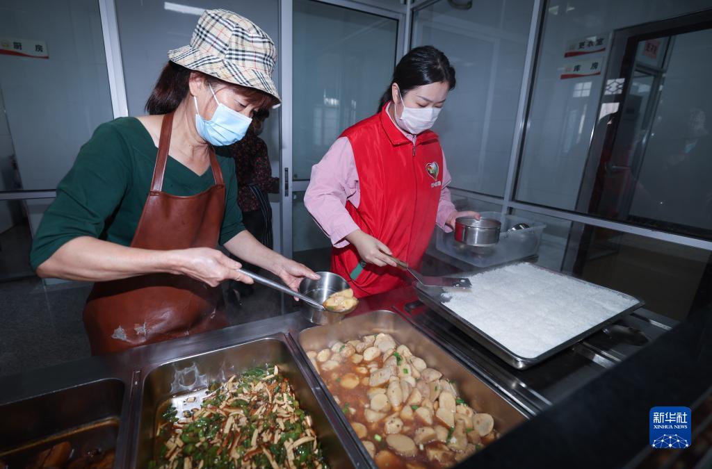 10月15日,在杭州市富陽區里山鎮民強村老年食堂,工作人員給老人配餐。