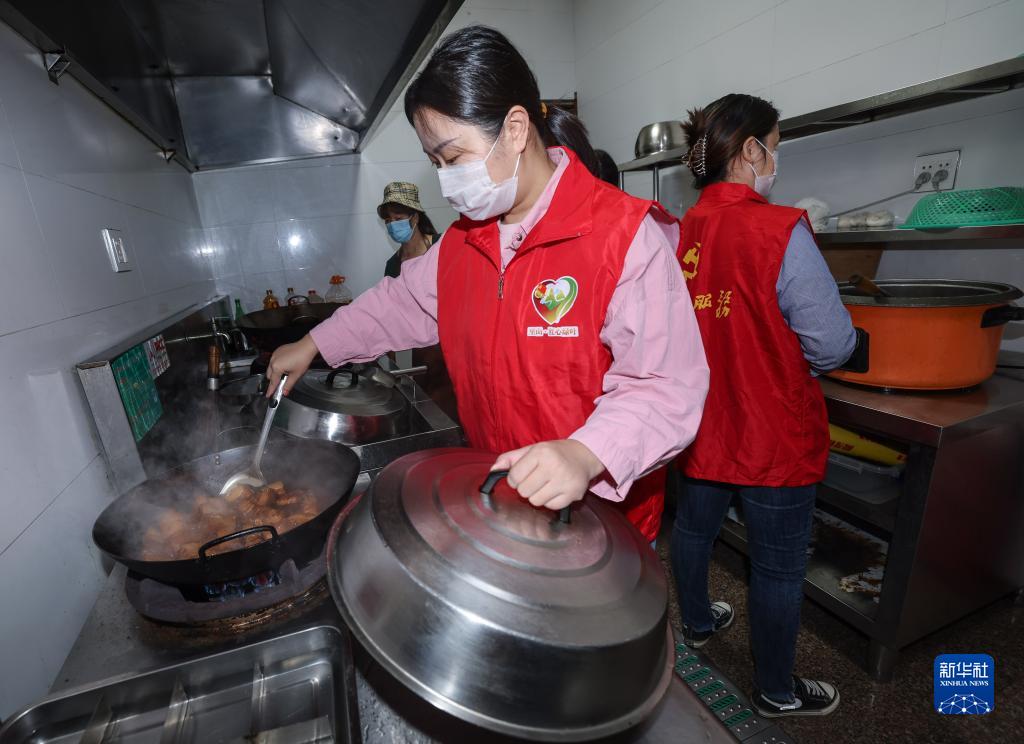 10月15日,黨員志愿者在杭州市富陽區里山鎮民強村老年食堂幫廚。