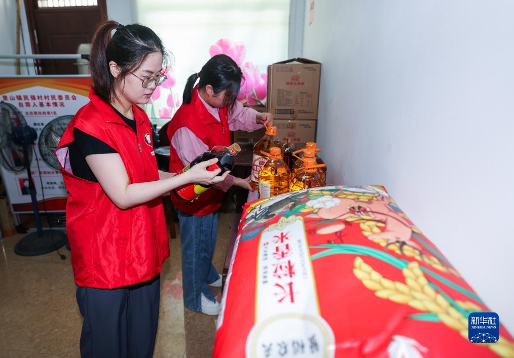 10月15日,在杭州市富陽區里山鎮民強村老年食堂,黨員志愿者清點鄉賢捐贈的物品。