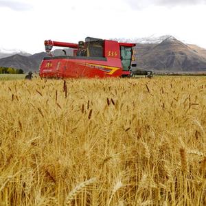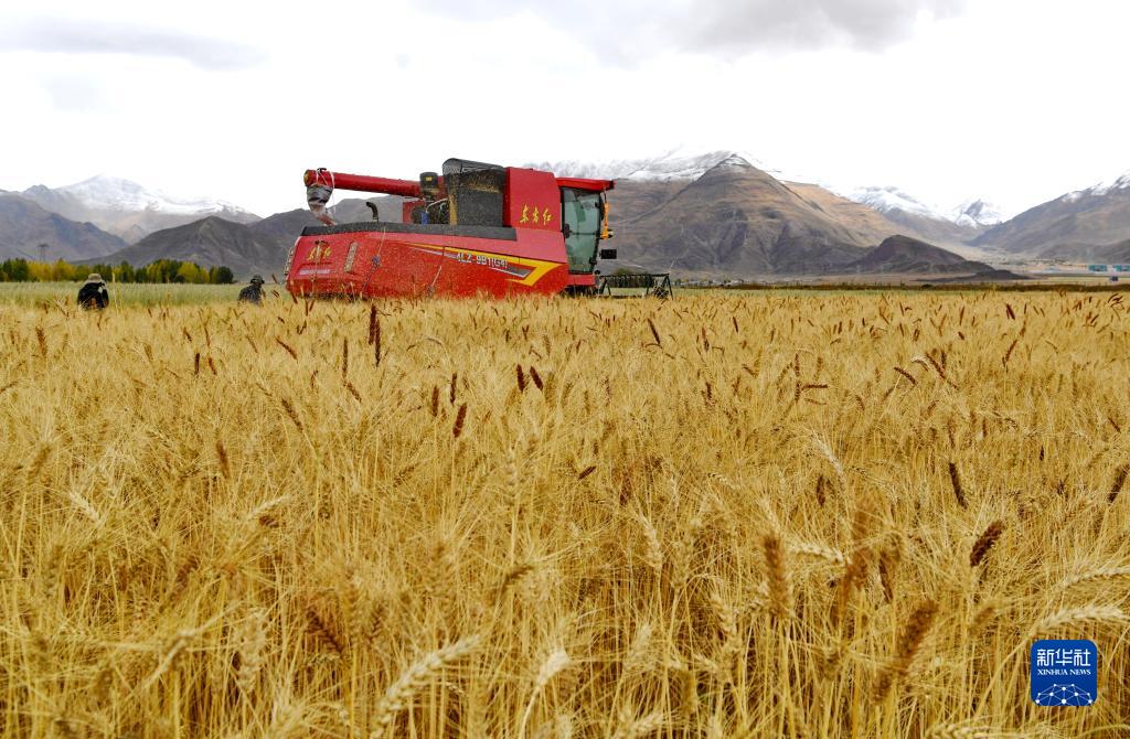 工作人員駕駛農業機械在西藏拉薩市林周縣曲果強村的高標準農田里收獲小麥(10月12日攝)。