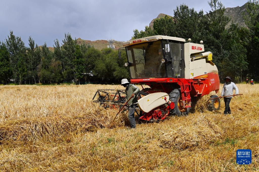 西藏曲水縣才納鄉白堆村村民在高標準化農田內收獲青稞(9月11日攝)。