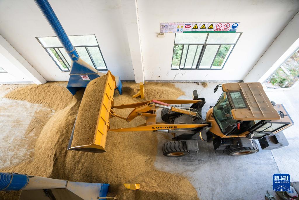 10月15日,在南縣南洲橋國家糧食儲備中心,工作人員駕駛叉車把糧食送進烘糧設備。