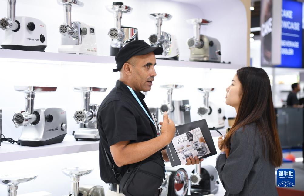 10月15日,一名外國采購商在一家小家電展臺洽談業務。
