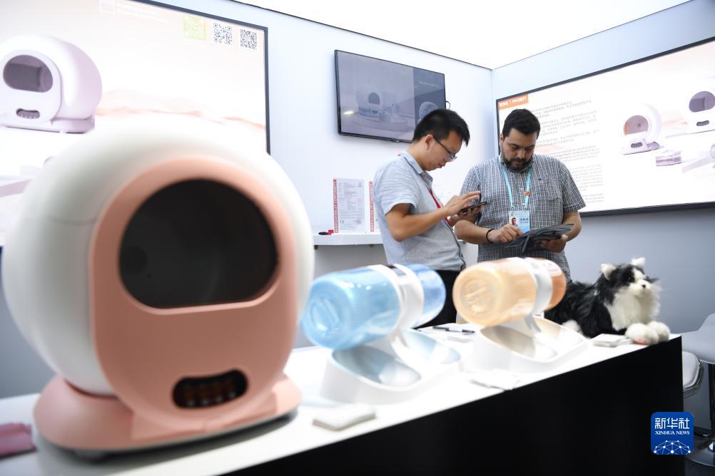 10月15日,在一家智能貓砂盆產品展臺,外國采購商在了解信息。