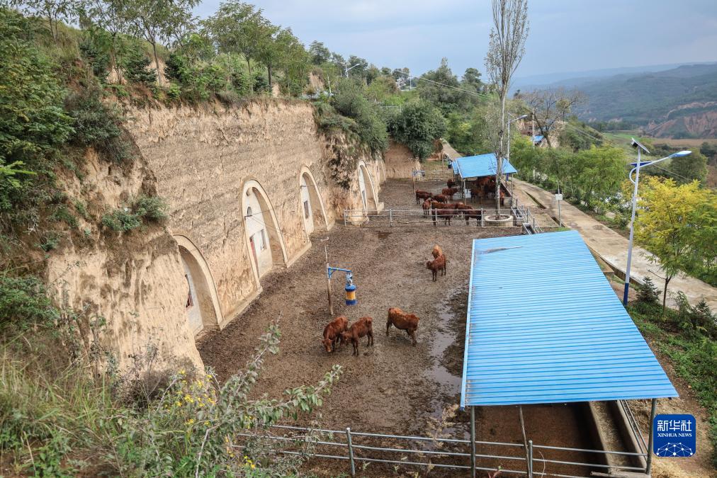 這是10月12日在甘肅省平涼市崇信縣黃寨鎮甘莊村拍攝的窯洞養牛產業。
