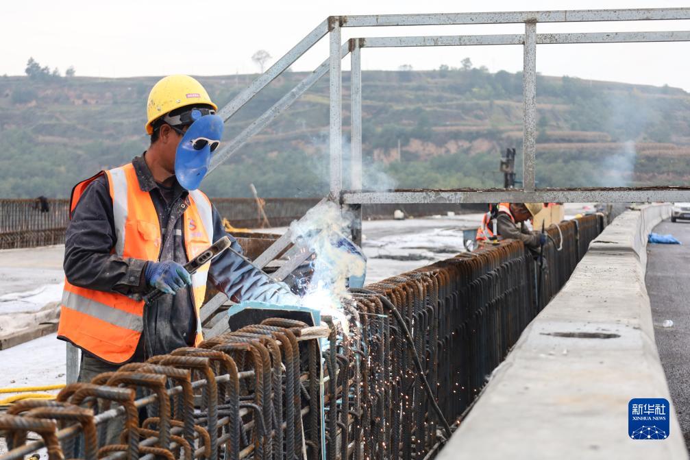 10月13日,工人在甘肅省平涼市境內的S28靈華高速一期、二期及東延線項目現場施工。