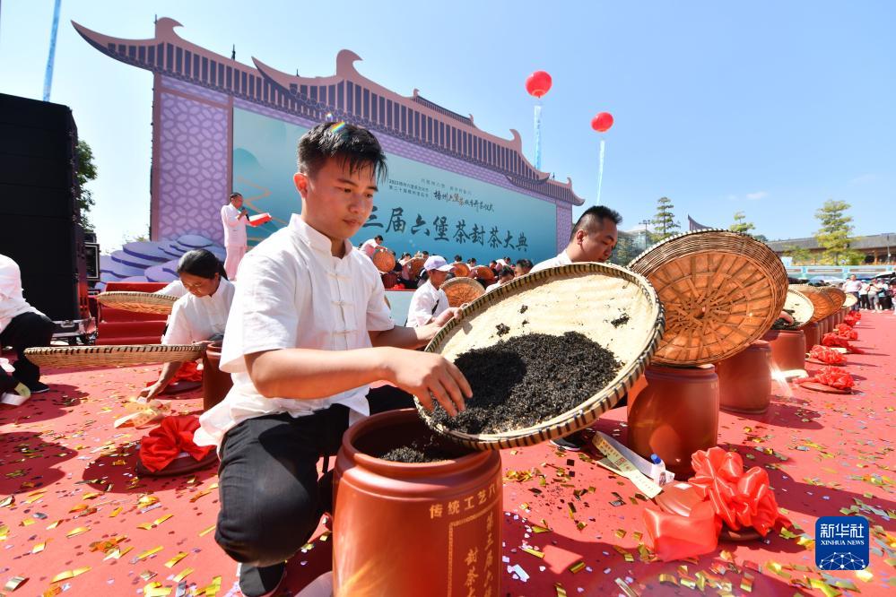 10月15日,在梧州市蒼梧縣六堡鎮六堡茶文化廣場,當地制茶人進行封茶儀式。