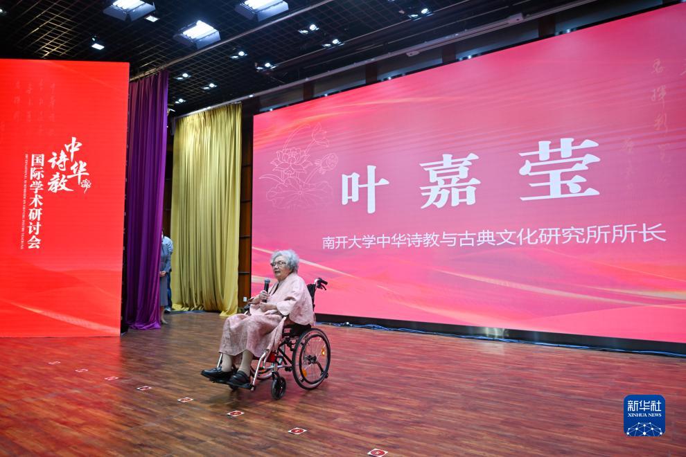當日,中華詩教國際學術研討會在天津南開大學開幕,來自中國、美國、加拿大、日本等國家和地區的近200位學者參會,共話中華詩教的傳承與弘揚。研討會現場,年近百歲高齡的葉嘉瑩先生坐著輪椅登臺,講述自己的詩詞人生與詩教情懷,并對年輕人送出鼓勵寄語。