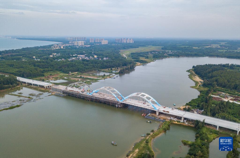 10月14日拍攝的建設中的海南環島旅游公路臨高段文瀾江大橋(無人機照片)。
