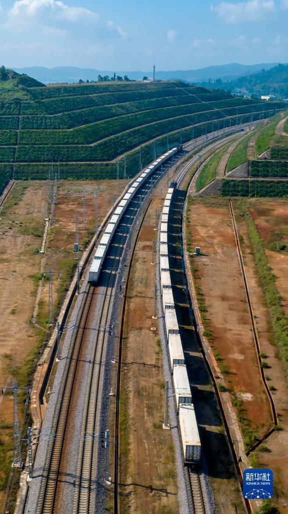 10月16日,中老、中越國際冷鏈貨運班列從云南省玉溪市研和站發車啟程(無人機照片)。