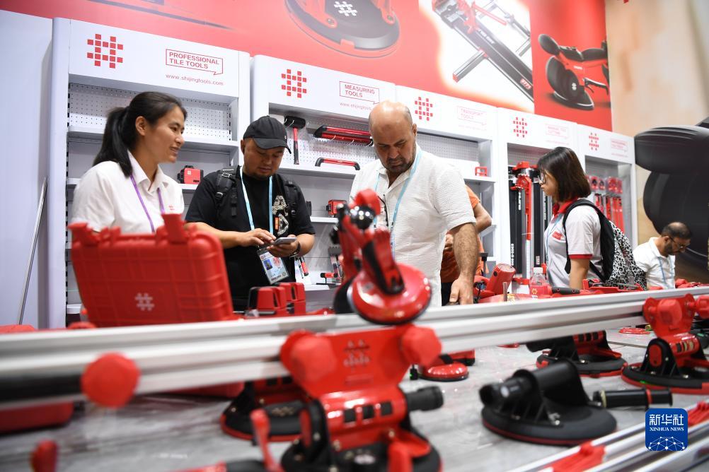 10月16日,來自伊拉克的采購商(右)在鋪貼工具展臺洽談。