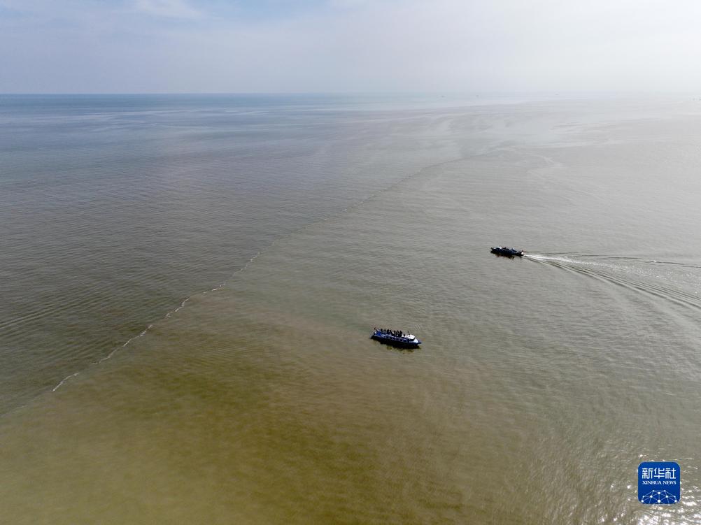 在山東省東營市黃河入???,黃河匯入渤海。黃色的河水和藍色的海水之間形成了一條“分界線”,河黃海清,涇渭分明。