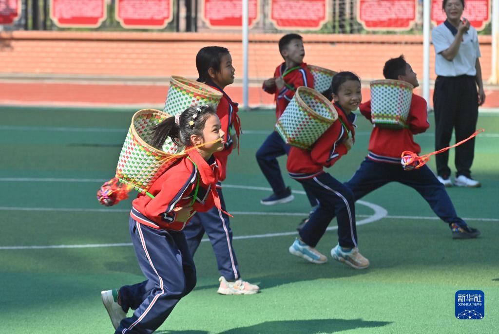 10月16日,在梧州市長洲區龍平小學,學生們在體育課上進行拋繡球比賽。